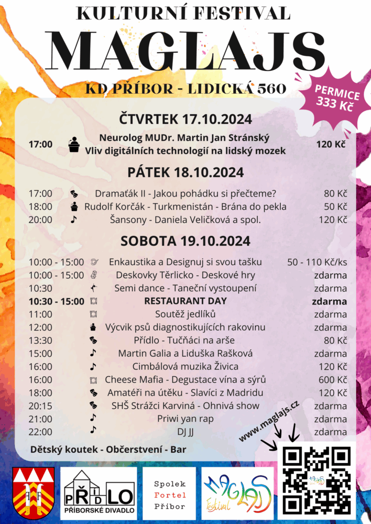 3. ročník festivalu Maglajs přinesl do Příbora pestrou paletu zážitků pro všechny generace. Během tří dnů se návštěvníci ponořili do světa přednášek, divadla, hudby, tvoření i chutí z celého světa. Od přednášky MUDr. Stránského přes cestovatelské okénko do Turkmenistánu až po sobotní Restaurant Day s cimbálovkou – Maglajs 2024 ukázal, že kultura má nekonečně mnoho podob.